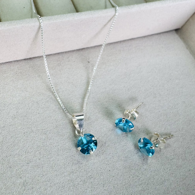 conjunto ponto de luz azul: corrente v12 45cm, pingente e um par de brincos .